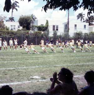 Above: the opening ceremony during Field Day at Palm Beach Day School, 20 April 1968. For intramural competition the school was divided into two teams, the “Pelicans” (blue uniforms) and “Flamingoes” (yellow uniforms.) Both my brother and I were in the latter. (View the video in QuickTime/iTunes format.)