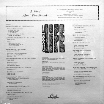 If you’re looking for an album that epitomises the guitar strumming, non-percussional style of music that dominated Catholic Masses during the 1970’s, it’s hard to beat this album. On top of that, the School Sisters (from Mankato, MN) perform in the cavernous, reverberant acoustics of so many older Catholic churches.