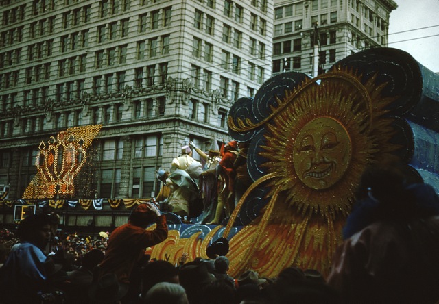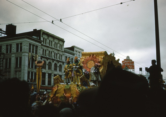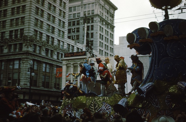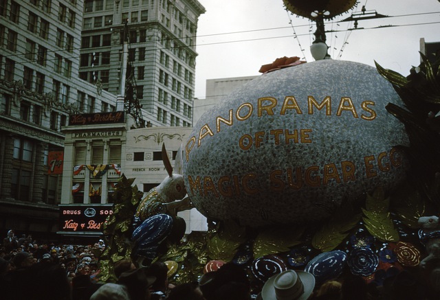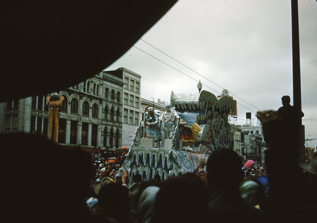 Update: I think I have dated these photos to 1952. The Krewe of Rex had as their theme that year “Panoramas of the Magic Sugar Egg,” (see this page) and same egg is shown in the fourth photo below. That would mean that these are exactly sixty years old, which vindicates the title.