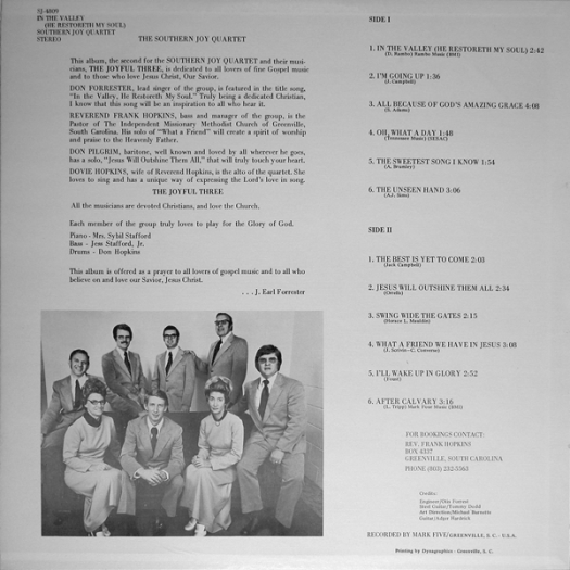 A very traditional Southern Gospel album. Although undated, I think it’s from the early 1970’s. One thing you immediately pick up on is the change in content of the songs; it’s hard to imagine even a classic like the title track making much of a dent these days with our obsessive ego-pumping. Vocals are excellent, instrumentation is plain. Southern Joy will have to wait until Over the Next Hill to really pull the emotional heart-strings that the genre is very going at doing.