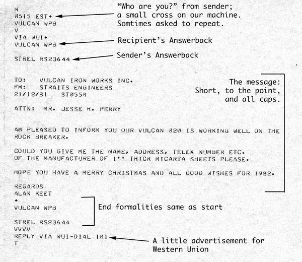 I have an entire page dedicated to explaining the telex, so you can find the details here. Although salutations are de rigeur for business letters, in the case of the telex they were not used for two reasons.
