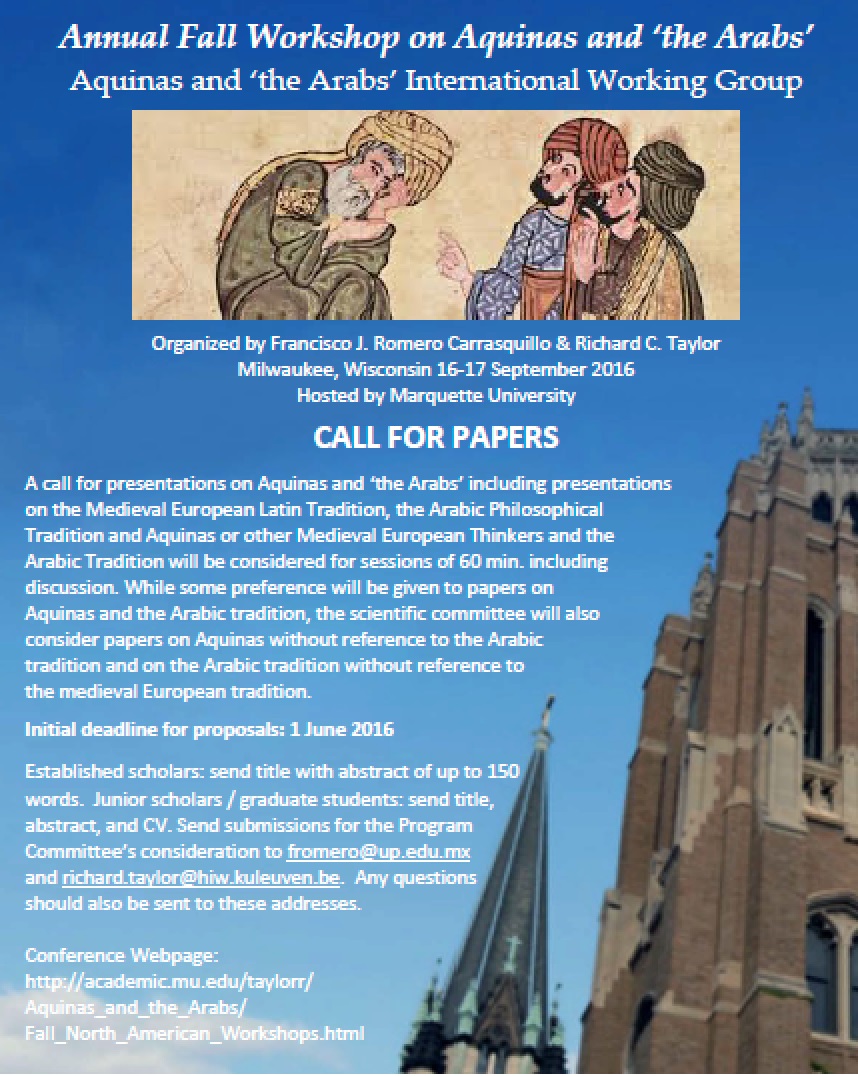 Returning to the site Ite ad Thomam, I saw an advertisement for the “Annual Fall Workshop on Aquinas and the ‘Arabs'” at Marquette University (not, these days, an ideal venue for such a traditional Catholic conference.) For someone like myself who started the Summa as an undergraduate and finished it as a PhD candidate, it looks to be interesting.