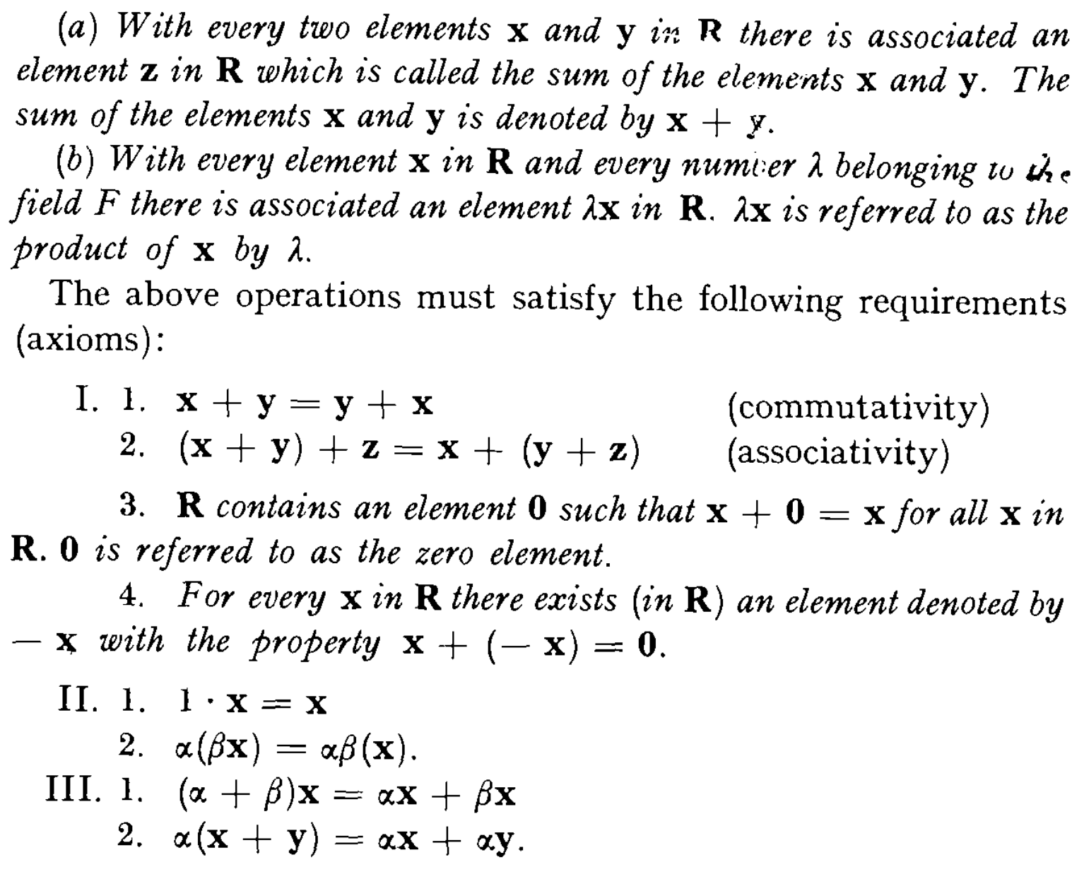 are to be added or multiplied by numbers. Any definitions of these operations are acceptable as long as the axioms listed above are satisfied. Whenever this is the case we are dealing with an instance of a vector space.