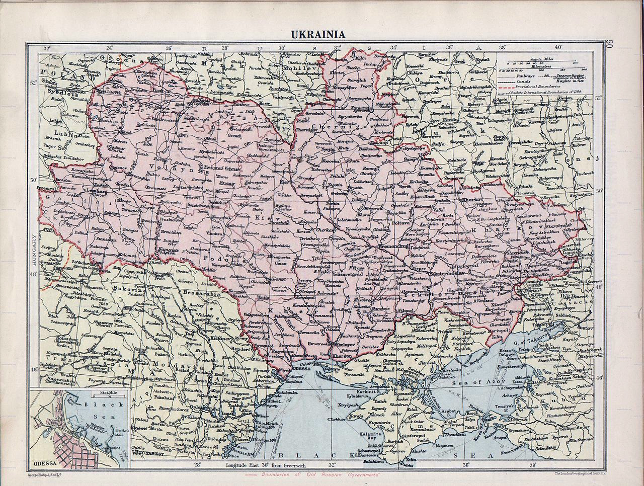 …is shown in the map above. It’s a map from the London Geographical Institute in 1920, showing the extent of the Ukraine in the time of the Russian Civil War. It’s probably the outline of the independent Ukraine that the likes of Symon Petliura fought unsuccessfully for, a holdover (as the map shows) from Tsarist times. And, of course, it’s without the primarily Russian (or at least non-Ukrainian) Crimea. That was added in a latter Soviet deal in an era when the boundaries of the Republics could be easily moved.