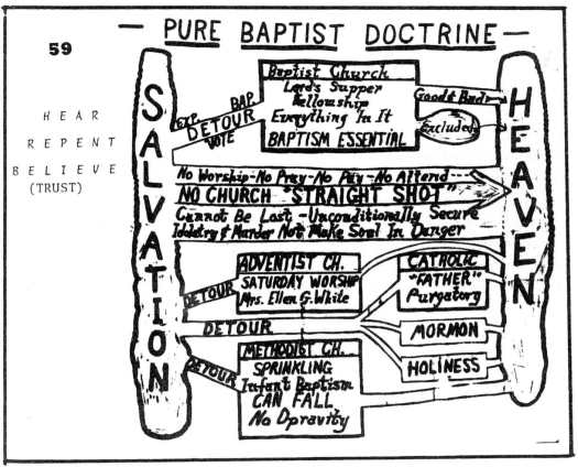 By the time of the Garner-Smith debate projected visuals were reasonably common, in the form of the infamous “view graphs.” Some (like these) look primitive now, although they’re not much better than some of the ones I saw at Texas Instruments. The first one I want to put up is from Smith, showing his idea of what the Baptists believe about salvation (and their idea that baptism isn’t necessary for that.)