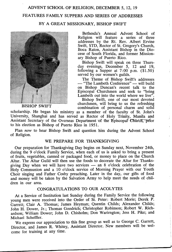 - The bulletin notes the induction of several acolytes into the Order of St. Peter, whose “manual” is here. For me it was, in some ways, too late in the game: I was regularly at Bethesda for less than a year after the induction before going away to prep school.